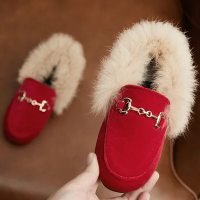 Kids Fur Shoes Children Velvet Shoes Baby Girls Warm Flats Toddler Black Brand Shoes Princess Loafer Chain Moccasin For Winter