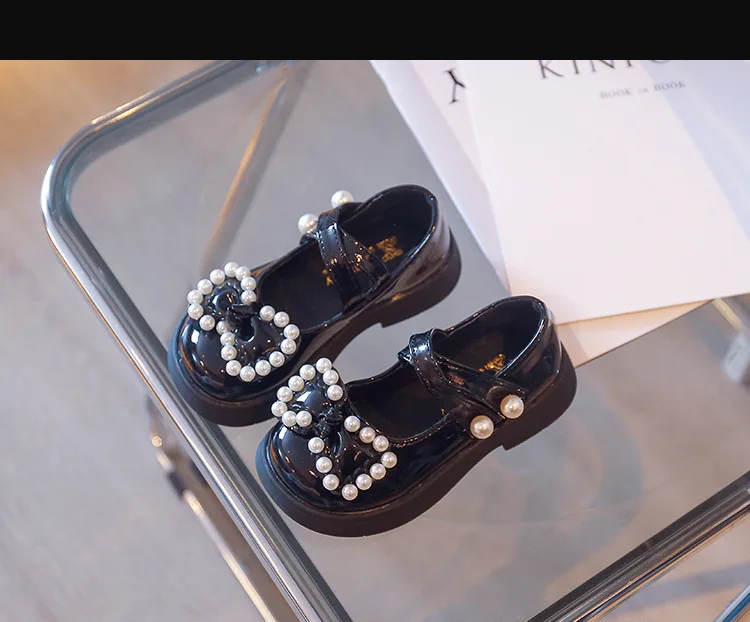 Korean Leather Shoes Soft-soled Kids Princess Shoes 2022 Spring New Children's Fashion Solid Black Baby Girls Pearls Bow Loafers 5