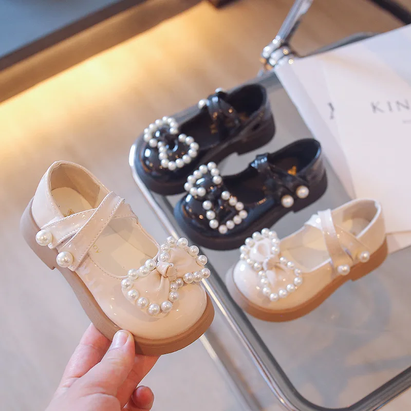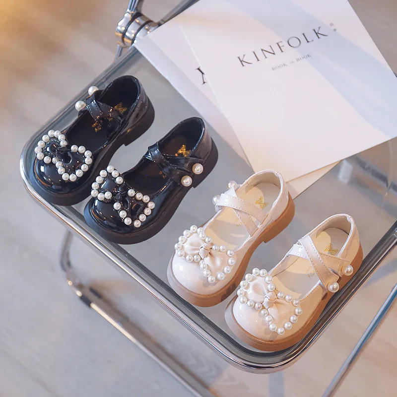 Korean Leather Shoes Soft-soled Kids Princess Shoes 2022 Spring New Children's Fashion Solid Black Baby Girls Pearls Bow Loafers 2