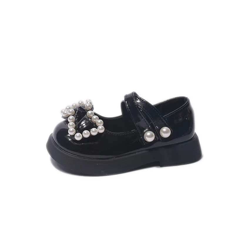 Korean Leather Shoes Soft-soled Kids Princess Shoes 2022 Spring New Children's Fashion Solid Black Baby Girls Pearls Bow Loafers 6