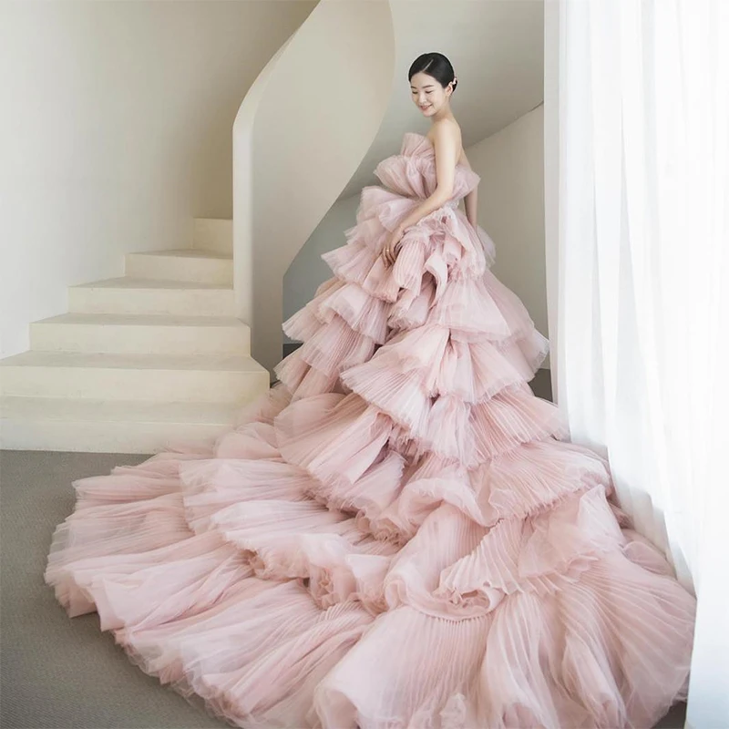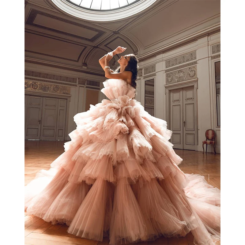 Luxury Ball Gown Tulle Evening Dresses Arabic Dubai Colorful Wedding Gowns Strapless Puffy Long Train Layered Ruffles Prom Dress 5