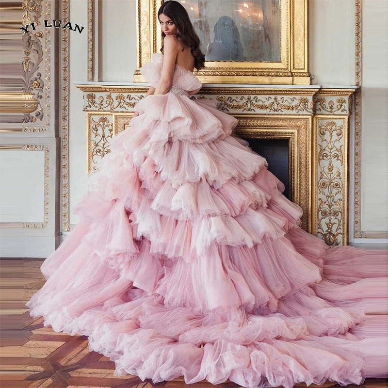Luxury Ball Gown Tulle Evening Dresses Arabic Dubai Colorful Wedding Gowns Strapless Puffy Long Train Layered Ruffles Prom Dress 1