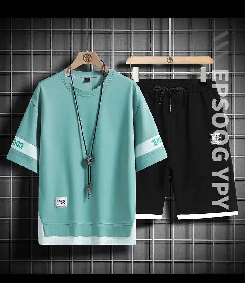 New Summer New Mens Set Hip Hop Fashion Tracksuit T-shirt and Shorts Two Piece Set Men Patchwork Color Streetwear Outfit Set