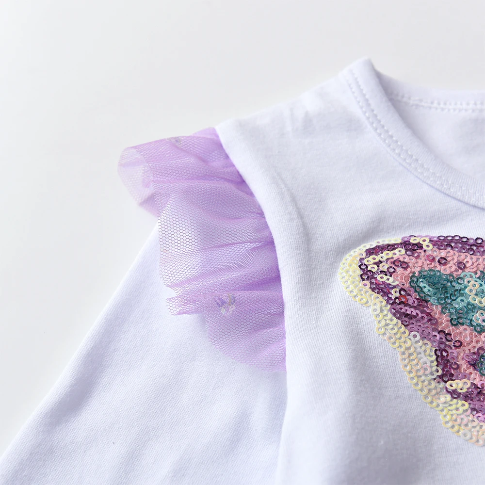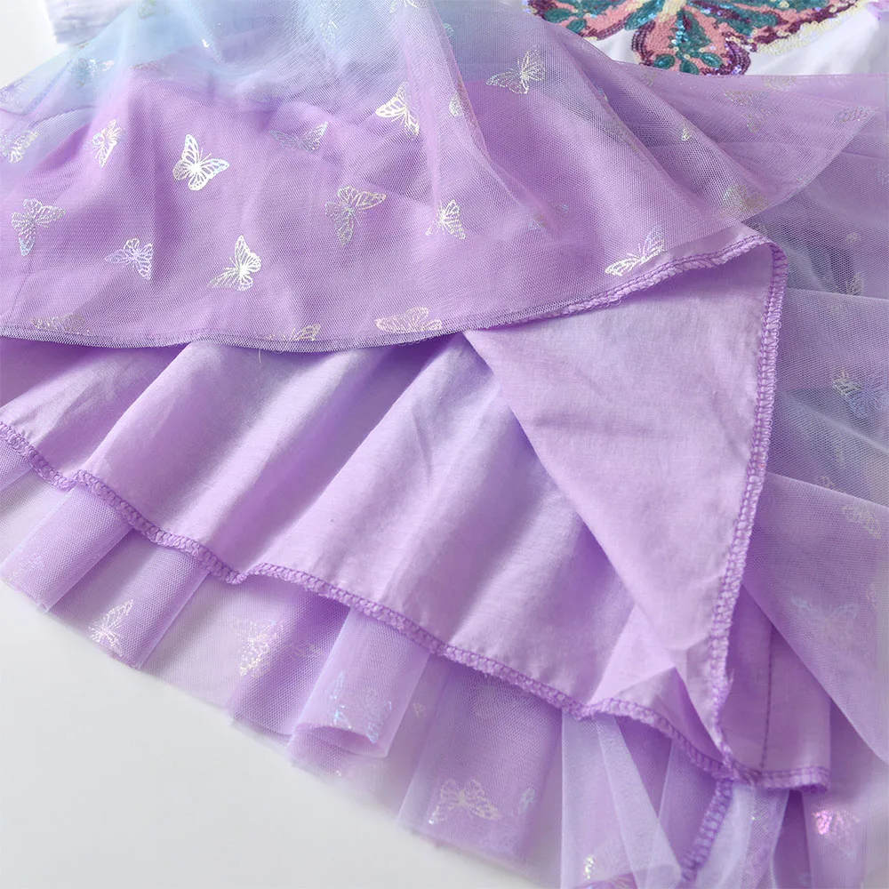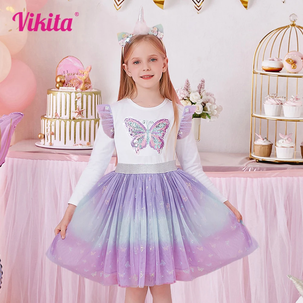 VIKITA Autumn Girls Dress Butterfly Sequins Kids Long Sleeve Dresses Baby Girls Princess Dress Party Clothes Birthday Dresses